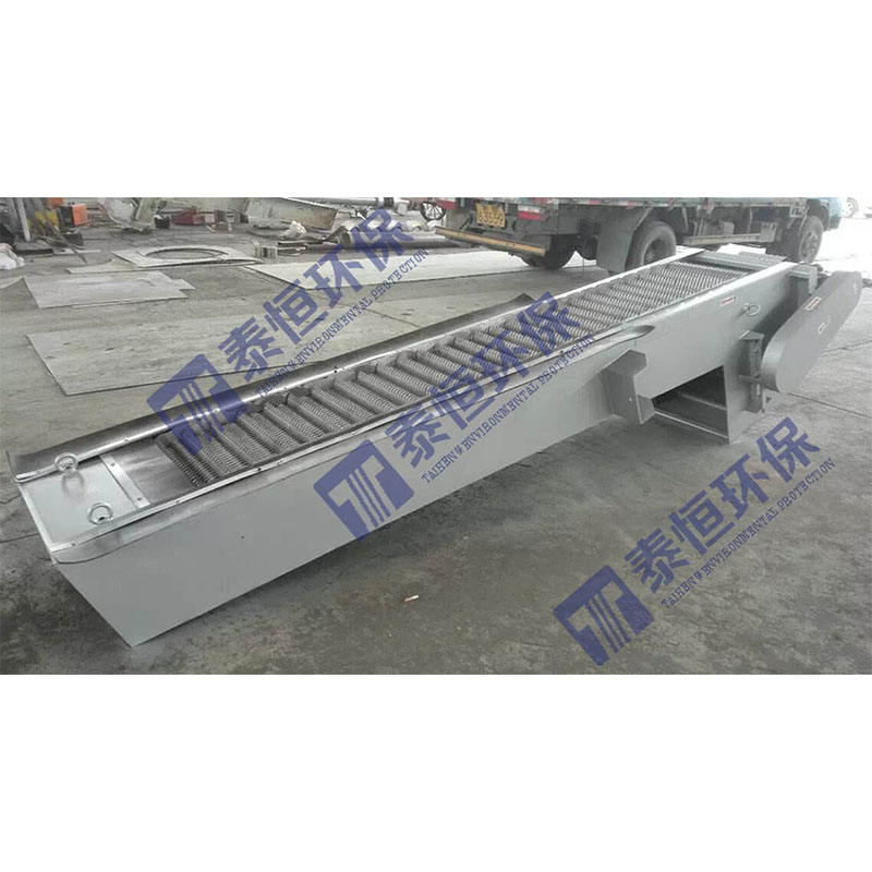 回轉(zhuǎn)式格柵除污機(jī)設(shè)備是由一種獨(dú)特的耙齒廠裝配成一組回轉(zhuǎn)格柵鏈。在電機(jī)減速器的驅(qū)動(dòng)下,耙齒鏈進(jìn)行逆水流方向回轉(zhuǎn)運(yùn)動(dòng)。耙齒鏈運(yùn)轉(zhuǎn)到設(shè)備的上部時(shí),由于槽輪和彎軌的導(dǎo)向,使每組耙齒之間產(chǎn)生相對(duì)自清運(yùn)動(dòng),絕大部分固體物質(zhì)靠重力落下。另一部分則依靠清掃器的反向運(yùn)動(dòng)把粘在耙齒上的雜物清掃干凈。按水流方向耙齒鏈類同于格柵,在耙齒鏈軸上裝配的耙齒間隙可以根據(jù)使用條件進(jìn)行選擇。當(dāng)耙齒把流體中的固態(tài)懸浮物分離后可以保持水流暢通流過。整個(gè)工作過程是連續(xù)的,也可以是間歇的。